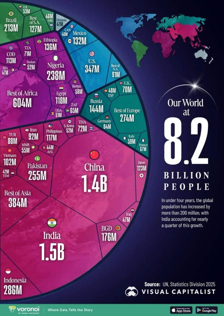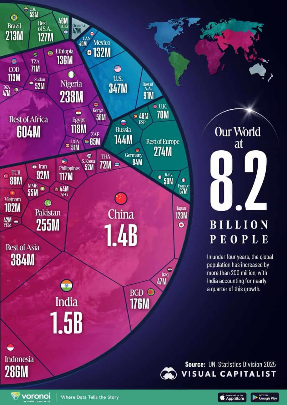 “The Entirety of the World’s 8.2 Billion Population in One Chart – The global population surpassed 8.2 billion in 2025, up from 8.0 billion in 2022. India drove nearly a quarter of global population growth over the period, with its population now close to 1.5 billion. After reaching 1 billion people in 1804, the world’s population has expanded eightfold over roughly 200 years. Since 2022, the global population has increased by more than 200 million despite widespread declines in birth rates. While the populations of China and Brazil have shrunk, India and Nigeria have been significant drivers of overall population growth.”, Visual Capitalist and the UN Statistics Division, January 25, 2026
