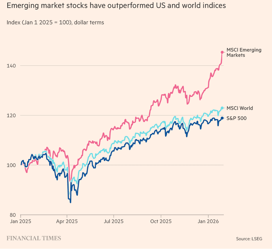 “Emerging markets make roaring start to 2026 as dollar slides – Stocks, bonds and currencies have all soared as dollar weakness puts focus on fundamentals. ‘Fundamentals in emerging markets have been improving for a while but it took the weak dollar for global investors to pay attention,’ said David Hauner, head of global emerging markets fixed-income strategy at Bank of America. Many emerging-market central banks have boosted interest rates well above inflation in recent years in an attempt to retain capital that was being enticed away by the rise in US interest rates since 2022, which helped drive a decade-long strengthening in the dollar. In comparison, the MSCI World index of advanced economy stocks is up 2.8 per cent this year, while the S&P 500 index of US blue-chip stocks is up 1.6 per cent.”, The Financial Times, January 29, 2026