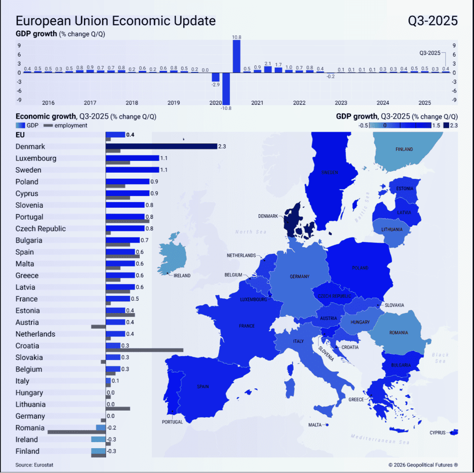 “Uneven Growth Continues to Plague Europe – Germany and France are lagging behind. Gross domestic product in the European Union grew 0.4 percent in the third quarter of 2025 relative to the previous quarter, demonstrating resilience in the face of immense challenges, including trade disputes with the U.S. and fierce competition from China. Denmark saw the highest rate of growth, driven by its pharmaceutical industry. However, growth across the Continent was again highly uneven. While less economically developed countries surged ahead (in Poland, for example, household consumption and rising consumer sentiment fueled increases in GDP and employment), key European heavyweights remain in limbo. In Germany, the EU’s traditional economic engine, unemployment reached a 12-year high, and political instability in France is also leaving its mark on growth. Additionally, Europe’s shift away from cheaper Russian energy has left it dependent on a limited number of costlier alternatives.”, Geopolitical Futures, January 30, 2026