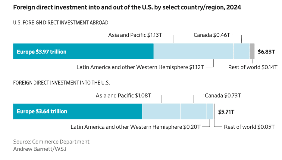 “What a Break With Europe Means for the American Economy – Europe is the U.S.’s biggest trading partner, largest investor and closest financial ally. The economies of the U.S. and Europe are intertwined. The European Union is the U.S.’s biggest trading partner—and Europe is the largest source of foreign direct investment in the U.S., with $3.6 trillion invested into the U.S. as of 2024. It goes the other way, too: U.S. companies make a fortune selling software, financial products and oil across the Atlantic. While the trans-Atlantic goods trade has grown more slowly since the 2007-09 recession, U.S. services exports have continued to expand rapidly. That includes financial, legal and insurance services, but increasingly centers on digital services and cloud computing provided by leading American tech companies such as Microsoft, Amazon.com, Google and International Business Machines. The European Union is the largest destination for U.S. services exports, which for the bloc totaled $294.7 billion in 2024.”, Wall Street Journal, January 19, 2026.