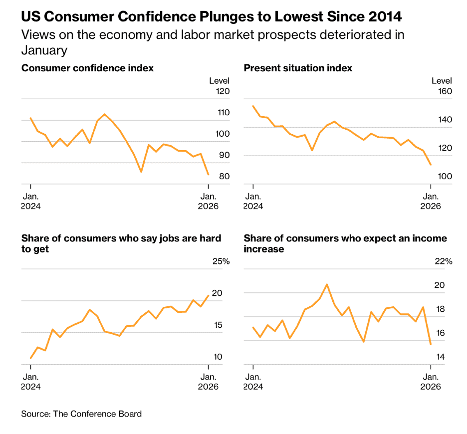“US Consumer Outlook at Its Darkest in 12 Years – US consumer confidence plummeted in January to the lowest level in 12 years on more pessimistic views from Americans worried about the nation’s economy, inflation and a weakening labor market. The gauge by the Conference Board decreased to 84.5, from an upwardly revised 94.2 last month, data out Tuesday showed. The figure was the lowest since May 2014 and fell short of all estimates in a Bloomberg survey of economists. In write-in responses to the survey, consumers often mentioned prices of oil, gas and groceries, said Dana Peterson, chief economist at the Conference Board. Mentions of politics, the labor market and health insurance also rose.”, Bloomberg,