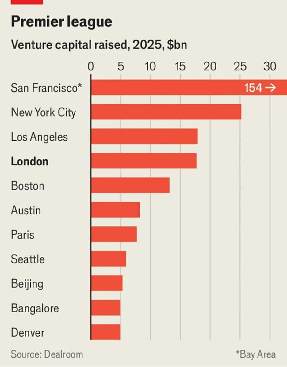 “How London became the rest of the world’s startup capital – Outside America, no other city comes close. London is one of the best places in the world to start a company. It has produced more unicorns ($1bn-plus startups) than Berlin, Paris and Tokyo combined. Their alumni are now spawning a second generation of firms. It is the world’s fourth-largest venture hub, according to Dealroom, a data provider. In 2025 its startups raised $17.7bn, behind only the Bay Area, New York and Los Angeles. Three main ingredients explain the city’s enduring success. The most important is talent. London is one of the world’s most diverse startup hubs. More than half of Britain’s fastest-growing startups were founded by immigrants. Capital is the third ingredient. London struggles to fund companies at later stages (hence the flight problems). But it excels at nourishing them early on and is beginning to attract more specialist investors for that crucial early stage.”, The Economist, January 26, 2026