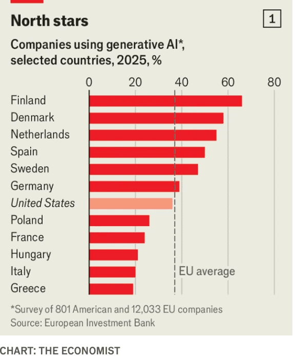 “Europe can still win the other AI race – Use of the technology is picking up pace. From cloud-computing to 5g, European companies have tended to be slow in adopting new technologies. Many feared that the same would happen with the most recent wave of so-called generative ai. The opportunity is big. Europe has a large industrial base and it is hunting for ways to boost economic growth. Already Europeans as individuals are among the most enthusiastic adopters of generative ai. According to research from Microsoft, a software giant, 32% of them use the technology, based on a population-weighted average of European countries, compared with 28% of Americans and 16% of Chinese.”, Economist, January 22, 2206