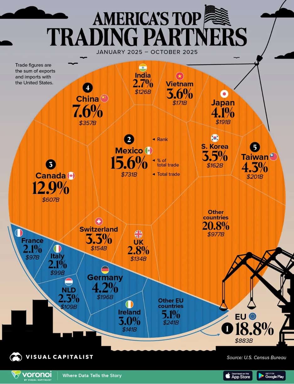 “America’s Top Trading Partners in 2025 – This graphic shows America’s biggest trading partners in 2025 through October, based on data from the U.S. Census Bureau. U.S. bilateral trade reached $4.7 trillion between January and October 2025, in a volatile year for trade policy. The European Union accounted for 18.8% of all U.S. trade in the first 10 months of 2025, valued at $883.3 billion. China ranks as America’s fourth-largest trading partner, with U.S. imports declining 26.7%, given rising tensions. In August 2025, the U.S. and EU agreed to a framework that set a 15% tariff ceiling on most goods, while existing 50% U.S. tariffs on steel and aluminum were left in place for all global trading partners. Mexico follows, with $731.2 billion in cross-border trade in 2025. After the U.S. announced tariffs on Mexican imports in February 2025, subsequent negotiations led to delays and partial exemptions. Ranking in third is Canada, with $606.7 billion in trade value.”, U.S. Census Bureau and Visual Capitalist, January 25, 2026