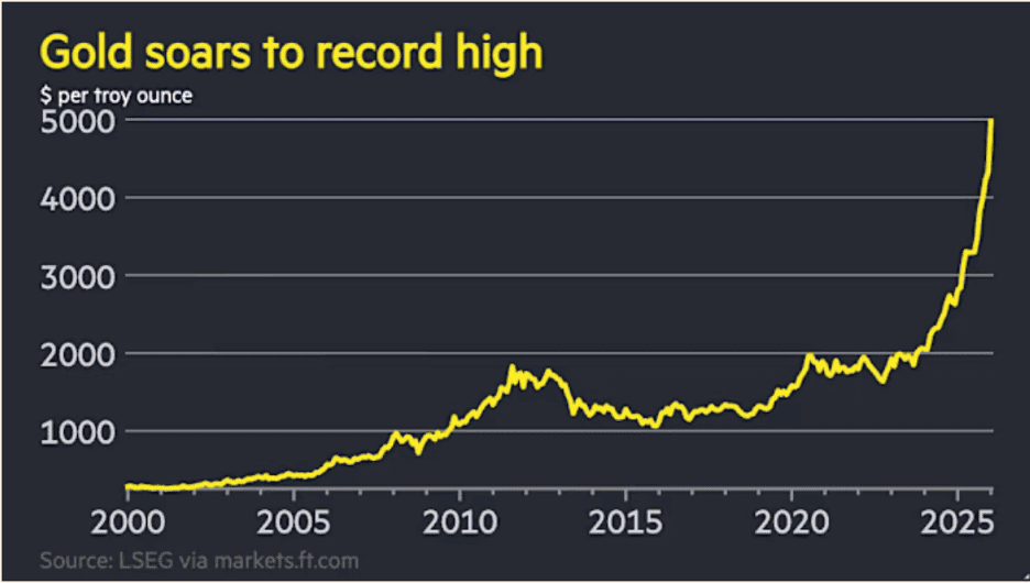 “Dollar sinks to 4-month low and gold soars past $5,000 as yen leaps – Japanese currency climbs sharply on speculation of joint US-Japan market intervention, adding to pressure on greenback. The dollar, which analysts said was also suffering from concerns over a potential US government shutdown, fell 0.6 per cent on Monday against a broader group of major currencies, extending the losses sparked by last week’s Greenland crisis. As US risks pushed investors out of the dollar, they sought safety in precious metals, sending gold to an all-time high and silver to its highest level since 2008.”, The Financial Times, January 25, 2026