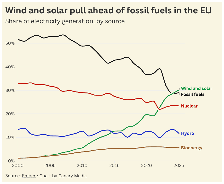 “In the EU, wind and solar surpass fossil fuels for first time – The watershed moment comes as the region looks to prioritize clean, domestic energy sources over dirty coal or imported natural gas. In 2025, wind and solar produced more electrons for the EU than fossil fuels did, per a new Ember report — the first time that’s ever happened over the course of an entire year. Though wind still produces more power for the EU than solar does, it was the blistering growth of the latter that drove last year’s achievement. Last year, coal accounted for just 9.2% of the region’s electricity, and several EU nations have already phased it out entirely or committed to doing so before 2030.”, Canary Media, January 30, 2026