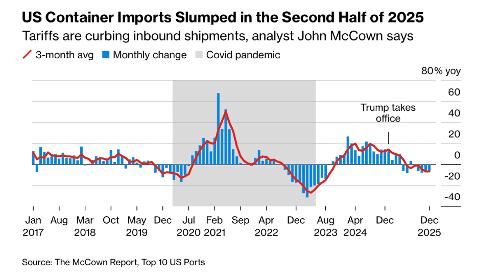 “US Container Growth Vanishes With World Trade Flows ‘Moving On’ – US container imports ended 2025 in a four-month skid that’s likely to lengthen this year as trade shifts to other economies to avoid President Donald Trump’s tariffs. Inbound volumes in December dropped 6.4% from a year earlier to 1.9 million 20-foot container units, after a 5.7% slide the previous month. The result is an upheaval in international commerce that ING Groep NV economists called “a global recalibration and the start of a new era” with the US lagging much of the world in growth rates for container shipping. Trump has used import taxes — actual or threatened — as leverage against trading partners, hoping to reduce the US trade deficit and increase domestic production. In response, major economies such as China and the European Union are seeking ways to reduce their reliance on the American market, and signing trade deals with other countries or blocs.”, Bloomberg, January 31, 2026