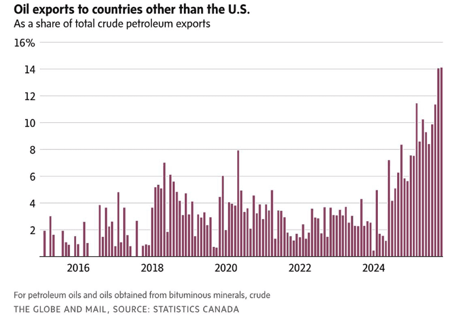 “Canada shipped a record share of oil to non-U.S. countries in November – The share of Canada’s crude petroleum flowing to countries other than the United States hit an all-time high in November, topping the previous month’s record, as the Trans Mountain pipeline boosted Canada’s trade diversification efforts. But while the latest trade numbers from Statistics Canada show the pivot away from the U.S. is working, the gains elsewhere have not been enough to make up for slumping demand from south of the border. Canada shipped 14.1 per cent of its crude to the rest of the world in November, with China alone accounting for 10 per cent of Canada’s total oil exports that month.”, The Globe and Mail, January 30, 2026