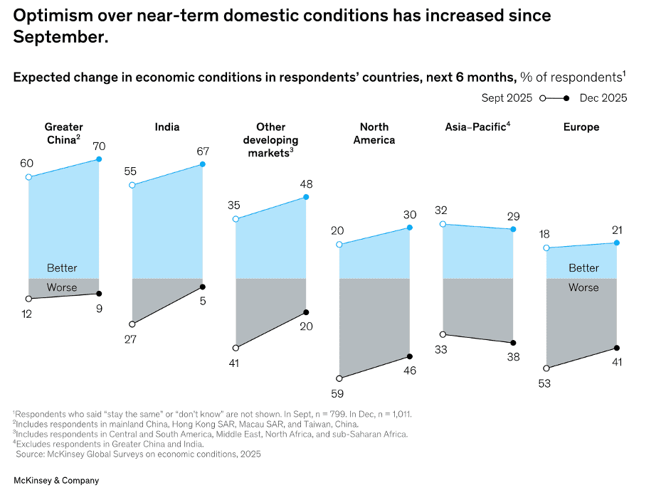 “Economic optimism returns – Executives around the globe have shown increased optimism about their domestic economies compared with just a few months earlier, according to a December 2025 McKinsey survey. Senior Partner Sven Smit and coauthors note that survey respondents in Greater China and India remain the most optimistic, with more than two-thirds in each region expecting economic conditions to improve in the next six months. Although sentiment has also brightened in North America and Europe, a significant share of executives in those regions still anticipate that conditions may worsen.”, McKinsey & Co., January 29, 2026