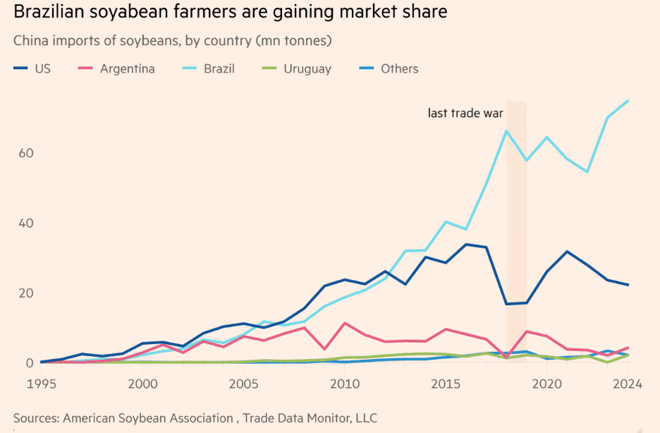 US soyabean farmers squeezed as China blocks imports and stockpiles rise – Overseas sales of top US export crop plummet as trade talks between Washington and Beijing stall. The new export season for soyabeans has opened with no sales or shipments to China, government data shows — a sharp break from a year ago, when it had already booked 6.5mn tons.  For decades, more than half of all US soyabeans went to China, the world’s biggest buyer. But this year, as trade talks between Washington and Beijing stall, not a single American soyabean has headed east, leaving farmers struggling to stay afloat as bins fill and prices sag while China turns to record supplies from Brazil.”, The Financial Times, September 26, 2025