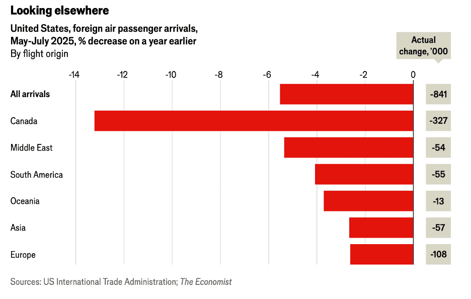 Have foreign tourists really avoided America this year?  Using monthly data on arrivals at all airports from America’s International Trade Administration, a government agency, The Economist finds that foreign arrivals at American airports are down by 3.8% compared with 2024, or 1.3m fewer people. The slump was steepest between May and July, when arrivals fell by 5.5% year on year. That bucked the global trend as tourism finally recovered to pre-pandemic levels. Travel and tourism make up around 3% of America’s gdp. But so far hotel operators have reported that higher spending by well-off domestic travellers has softened the blow.”, The Economist, August 26, 2025