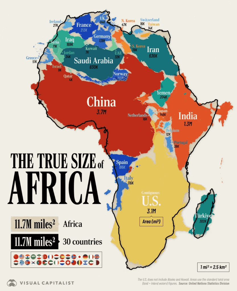 How Many Countries Fit in Africa? Visualizing the Continent’s True Size – The continent of Africa covers 11.7 million mi² (30.4 million km²), roughly equal to the size of 30 countries. These 30 include some of the world’s largest countries like the (contiguous) U.S., China, and India. However, the most common map projection, called the Mercator projection, makes Africa appear smaller than it actually is. For reference, Africa is the second-largest continent, both by size and population (1.6 billion people).”, Visual Capitalist & United Nations Statistics Division, September 20, 2025