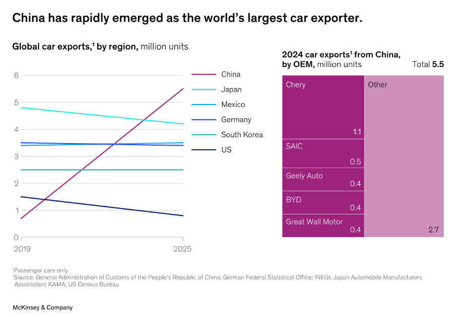 “China drives to the top – China has rapidly become the world’s largest car exporter, fueled in part by a surge in electric vehicle (EV) sales, positioning China as a key global player. In 2019, the country exported 0.7 million cars, but by 2024, that number had risen to 5.5 million, surpassing Japan, Mexico, and Germany. EVs composed nearly 40 percent of China’s passenger vehicle exports in 2024 and nearly half in the first half of 2025.McKinsey & Co., September 23, 2025