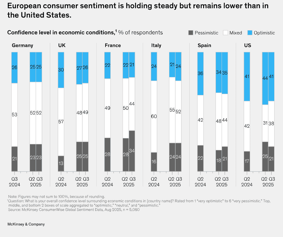 An update on European consumer sentiment: Cautious, but gearing up for the holidays – Despite geopolitical and economic uncertainty, European consumer sentiment is holding steady heading into the holiday season—with spending intentions remaining in line with last year’s levels. Inflation remains the top concern for consumers, but its gradual stabilization in the eurozone has allowed many shoppers to maintain their holiday budgets. Across EU-5 nations, net consumer sentiment—the difference between optimism and pessimism—remains relatively unchanged compared to previous surveys. Stable inflation rates and a resilient job market are likely strong drivers for this trend. However, France stands out as the exception, experiencing a significant uptick in pessimism with minimal corresponding movement in optimism. In contrast, sentiment in the United States has been more volatile, though it remains higher than European levels.”, McKinsey & Co., September 5, 2025