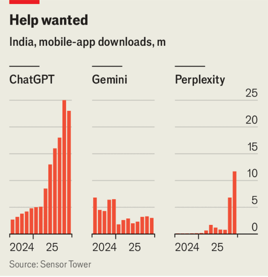 “AI is erupting in India – American firms are piling on users—and sucking up mountains of data. Sam altman is bullish about India. The co-founder of Openai, the firm behind Chatgpt, says the country’s adoption of artificial intelligence (ai) has been “unmatched anywhere in the world”. India is already Openai’s second-largest market by number of users and could soon be its biggest.  For Indians, the battle promises cutting-edge ai tools at extremely low cost. For ai firms, the payoff may lie less in revenue than in reach: the chance to lock in hundreds of millions of users, and the torrents of data they create. The opportunities in India are staggering. The country has around 900m internet users; only China has more. But unlike China, India is open to American tech firms.”, The Economist, September 17, 2025