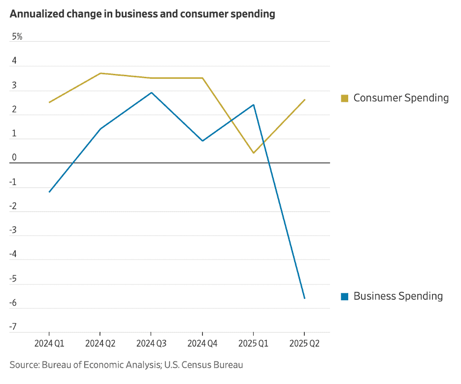 “Beneath the GDP, a Recession Warning – Business spending dropped sharply in the second quarter. Blame the trade war. Buried in last week’s BEA report is a much more reliable measure of the economy—gross output, or GO. It measures spending at all stages of production, totaling an estimated $63 trillion this year—more than twice GDP of $30 trillion.  GO revealed that economic growth is slowing to a crawl, ahead only 1.2% in real terms. If you include all transactions in wholesale and retail trade, the adjusted GO is up only 0.3%. More important, overall business spending fell sharply, by an annualized 5.6% in real terms. These results are much more consistent with the weak labor-market data.”, The Wall Street Journal, September 28, 2025