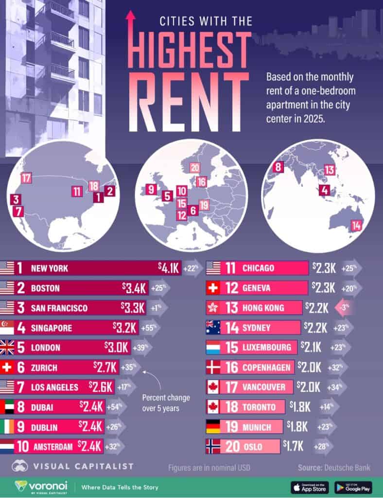Which Cities Have the Most Expensive Rent in the World in 2025? Across major cities worldwide, the cost of rent has climbed sharply in recent years. Record-high housing prices, paired with a wave of remote workers moving into new markets, are reshaping rental dynamics. At the same time, limited supply is tightening conditions even further, compounding challenges for renters in countless regions. New York has the highest rental costs globally, averaging $4,100 in 2025. Over the past five years, rent has surged across European cities, sparking protests. Singapore has the highest rent in Asia, at $3,300 per month, given its role as a financial hub.”, Visual Capitalist & Deutsche Bank, September 19, 2025